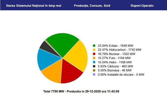 Consumul mic de energie, dar vântul puternic înseamnă o oportunitate bună de export pentru producătorii de energie eoliană. Acest lucru se întânmplă chiar azi când în jurul orei 11:43, aproape 24% din producţia de energie a României era generată de morile de vânt. Datele în timp real publicate pe site-ul Transelectrica arată că la ora menţionată, România exporta peste 1.600 MW de energie, în contextul în care producţia era de 7.756 MW, dar consumul de numai 6.138 MW. De obicei în perioada sărbătorilor, consumul de energie scade.
