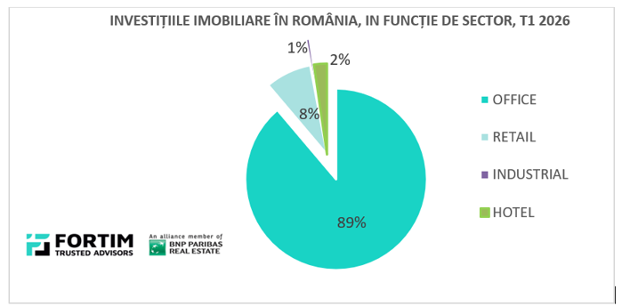 Piaţa investiţiilor imobiliare din România a înregistrat un volum total de aproximativ 152 milioane de euro în primul trimestru din 2026, în scădere faţă de perioada similară din 2025, într-un context caracterizat de prudenţă din partea investitorilor şi de o activitate selectivă, conform unui bilanţ realizat de către Fortim Trusted Advisors, membră în alianţa BNP Paribas Real Estate. Sectorul de birouri a dominat clar piaţa, concentrând 89% din volumul total tranzacţionat.