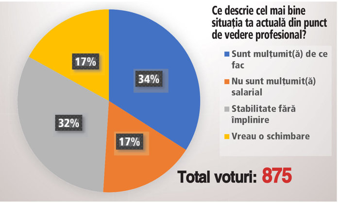 Cariera ocupă o mare parte din viaţa unei persoane, aşa că e normal să îţi pui unele întrebări privind satisfacţia pe care o resimţi la locul de muncă sau dacă eşti acolo unde îţi doreşti profesional. Unele persoane fac ceea ce le place, altele rămân pentru siguranţa financiară, iar altele simt că e timpul pentru o schimbare. Am întrebat pe toate platformele sociale: „Ce descrie cel mai bine situaţia ta actuală din punct de vedere profesional?“. Sondajul ZF a adunat 875 de răspunsuri şi surprinde o imagine clară asupra modului în care tinerii se raportează la locul actual de muncă.