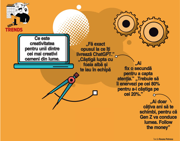 ♦ Ziarul Financiar a stat de vorbă cu unii dintre cei mai creativi oameni din industria advertisingului, comunicării şi marketingului pentru a afla ce este creativitatea şi cum te poţi raporta tu la ea într-o eră aparent dominată de inteligenţa artificială şi de tot zgomotul pe care aceasta îl aduce. Primul pas? ♦ Ia rezultatul pe care ţi-l dă ChatGPT şi fă ceva complet diferit mai departe. Cum poţi face acest lucru? ♦ Învaţă, citeşte, descoperă istoria artei, de exemplu ♦ Când îţi lipseşte baza, nu ai cum să mergi în profunzime ♦ Şi nu te teme să enervezi lumea.