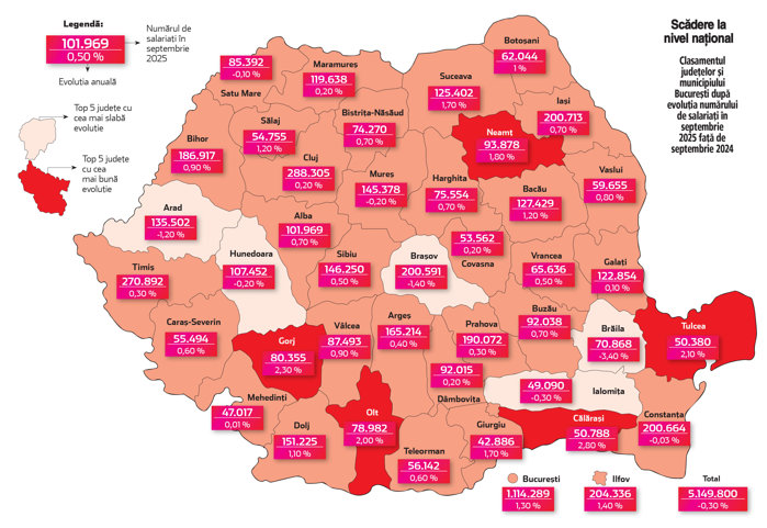 Harta recrutării la 9 luni din 2025: Creşteri punctuale în judeţele mici, stagnare în marile centre: scăderea pieţei muncii începe să se vadă în cifrele din judeţe. România a pierdut în ultimul an peste 13.600 de salariaţi
