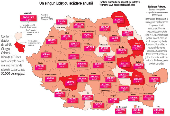 Harta recrutării, motiv de optimism. România angajează: aproape toate judeţele au câştigat salariaţi în ultimul an. Bucureşti, Cluj, Ilfov şi Timiş conduc topul. Doar judeţul Iaşi a înregistrat o scădere anuală a efectivului de angajaţi. Per total, economia românească a adăugat peste 41.800 de salariaţi noi în ultimul an