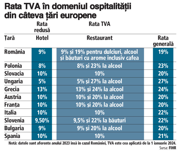 Hotelurile din România, o piaţă aflată în plină dezvoltare, plătesc printre cele mai mici TVA din Europa. Din regiune, doar Polonia şi Ungaria au TVA mai mică. În România, există 13.500 de unităţi de cazare, potrivit datelor Institutului Naţional de Statistică