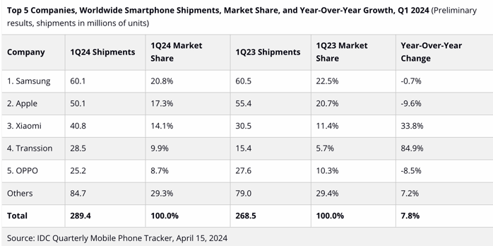 IDC: Piaţa mondială de smartphone-uri a crescut cu 7,8% în primul trimestru al anului 2024. Samsung a revenit liderul pieţei. Livrările Apple au scăzut cu 10%