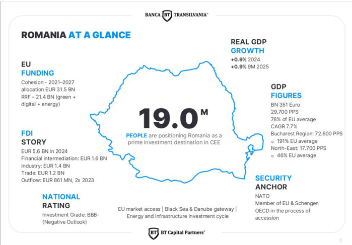 În faţa investitorilor străini, la Viena, Ioan Nistor, economist-şef, Banca Transilvania: „România intră într-o nouă fază de creştere bazată pe investiţii“, cu fonduri UE de peste 50 mld. euro şi deficit bugetar în scădere. Economia este setată să livreze creştere
