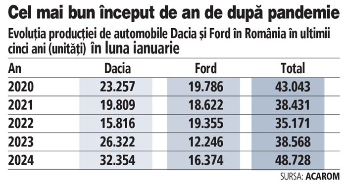 Început-record pentru producţia auto în ianuarie: Dacia a produs maximul ultimilor 5 ani, producţia Ford Otosan a urcat cu 33%
