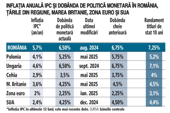 Inflaţia anuală IPC şi dobânda de politică monetară în România, ţările din regiune, Marea Britanie, zona euro şi SUA