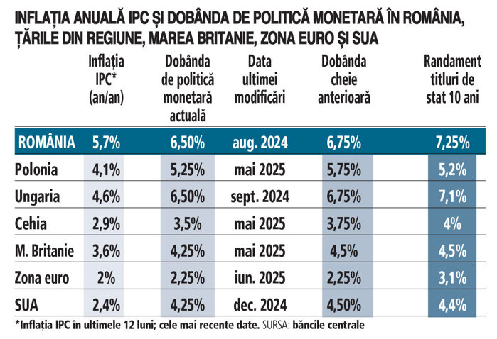 Inflaţia anuală IPC şi dobânda de politică monetară în România, ţările din regiune, Marea Britanie, zona euro şi SUA