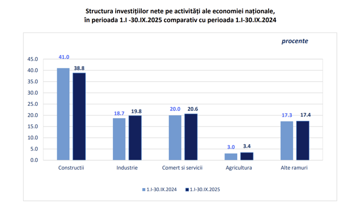 Investiţiile nete realizate în economia naţională au crescut în primele nouă luni din 2025 cu 3,9% fată de perioada similară din 2024, la un total de 143 miliarde lei, cea mai mare parte din sumă mergând spre zona de constructii, cu o pondere de 38,8%, arată datele INS.