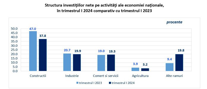 Investiţiile nete în economie au crescut în primul trimestru din 2024 cu 6,7% faţă de perioada similară a anului trecut, la un total de 34,6 miliarde lei, din care 53,3% au reprezentat lucrări de constructii noi, 28,2% achizitii de utilaje, inclusiv mijloace de transport, şi 18,3% alte cheltuieli, arată datele INS publicate miercuri.