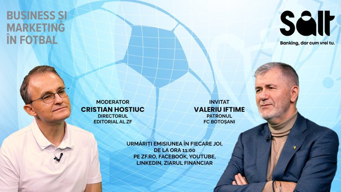 Joi, la ora 11:00, are loc a treia ediţie a emisiunii „Business şi marketing în fotbal”. Valeriu Iftime, patronul FC Botoşani, vorbeşte despre câţi bani a pierdut în fotbal şi ce trebuie făcut pentru ca Botoşani să ajungă pe plus.