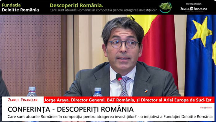 România se află, alături de Irlanda şi Polonia, în fruntea clasamentului în ceea ce priveşte creşterea PIB-ului în ultimii 10 ani, iar acest lucru dă multă încredere acţionarilor, să mizeze pe România şi să continue să investească aici, a declarat Jorge Araya, Director General, BAT România, şi Director al Ariei Europa de Sud-Est în cadrul conferinţei „Descoperiţi România. Care sunt atuurile României în competiţia pentru atragerea investiţiilor?“, organizată de Fundaţia Deloitte România. ”Suntem de 29 de ani in România. Am văzut aici mai mult decât o piaţă , am văzut potenţial. Avem un orizont de investiţii foarte lung. Am venit pentru oameni, o forţă e muncă educată şi pregătită. Un mediu stabil şi predictibil. Da, am avut câteva provocări, dar pe termen lung este o poveste de succes. Deschiderea guvernului spre dialog a fost esenţială pentru acţionarii noştri de a investi în România”.