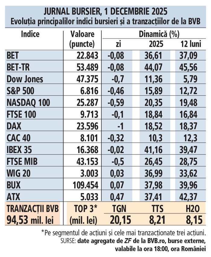 Jurnal bursier, 1 decembrie 2025. Evoluţia principalilor indici bursieri şi a tranzacţiilor de la BVB
