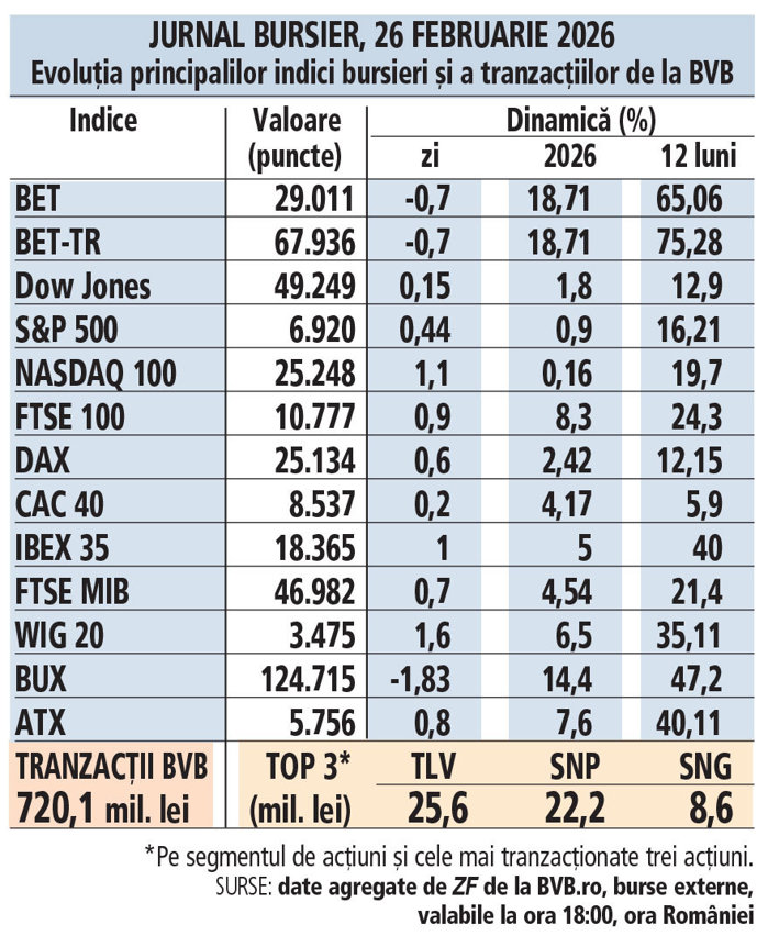 Jurnal bursier, 25 februarie 2026. Evoluţia principalilor indici bursieri şi a tranzacţiilor de la BVB