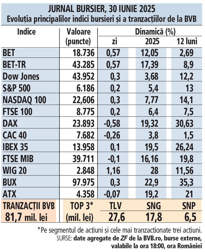 Jurnal bursier, 30 iunie 2025. Evoluţia principalilor indici bursieri şi a tranzacţiilor de la BVB