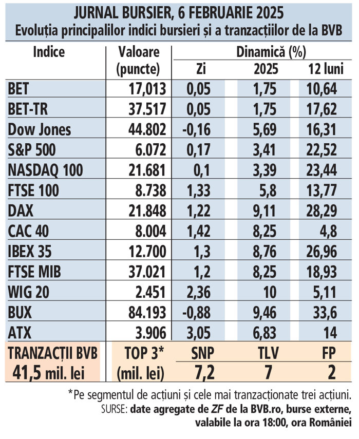 Jurnal bursier, 6 Februarie 2025. Evoluţia principalilor indici bursieri şi a tranzacţiilor de la BVB