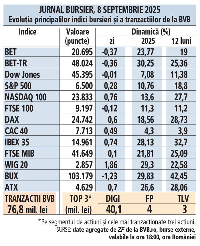 Jurnal bursier, 8 septembrie 2025. Evoluţia principalilor indici bursieri şi a tranzacţiilor de la BVB