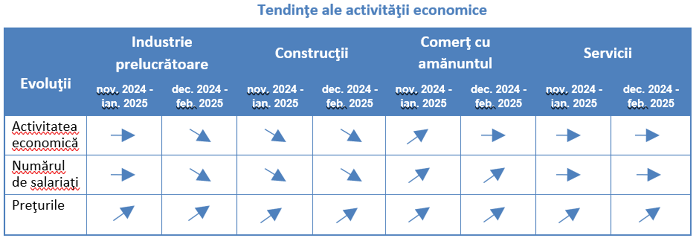 Managerii estimează pentru decembrie 2024 -februarie 2025 creşterea preţurilor în toate domeniile de activitate, relativa stabilitate a activităţii în comerţ şi servicii, în paralel cu scăderea moderată a numărului de angajati în industria prelucrătoare şi construcţii