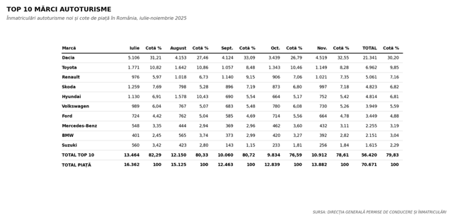 Producătorii auto din China au înmatriculat 2.776 de autoturisme noi în România în perioada iulie-noiembrie 2025, ajungând la o cotă cumulată de 4%, de la 2,5% în iulie la 5,4% în noiembrie. MG, BYD, Chery şi Geely câştigă teren în timp ce mărci precum Hyundai, Volkswagen şi Kia pierd puncte procentuale, chiar dacă volumele absolute au crescut odată cu piaţa.
