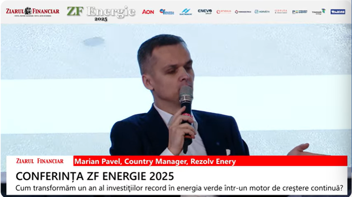 2025 a fost un an bun în energie regenerabilă, vedem multe proiecte concretizându-se, cum este parcul eolian Vifor pe care îl facem la Buzău, a declarat Marian Pavel, country manager Rezolv Energy în cadrul conferinţei CONFERINŢA ZF ENERGIE 2025.