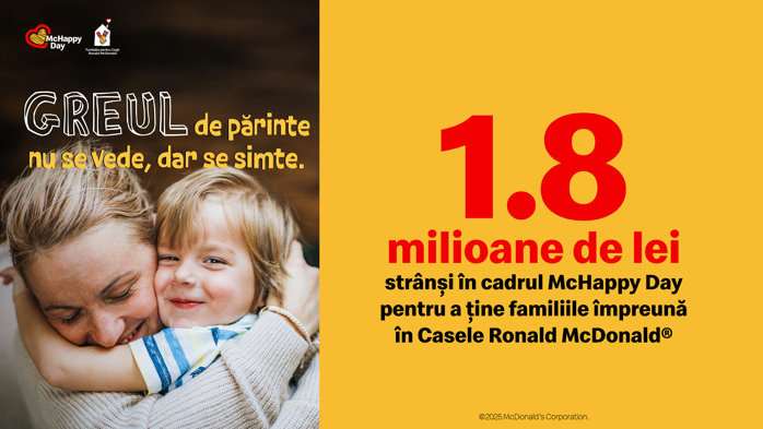 Anul 2025 marchează 30 de ani de prezenţă McDonald’s în România, un moment sărbătorit prin fapte care aduc oamenii împreună şi oferă sprijin acolo unde este cea mai mare nevoie. Cea de-a doua ediţie a campaniei McHappy Day, desfăşurată între 13 şi 19 octombrie, s-a încheiat cu un rezultat important: 1,8 milioane de lei strânşi pentru a susţine familiile copiilor internaţi în spitale.