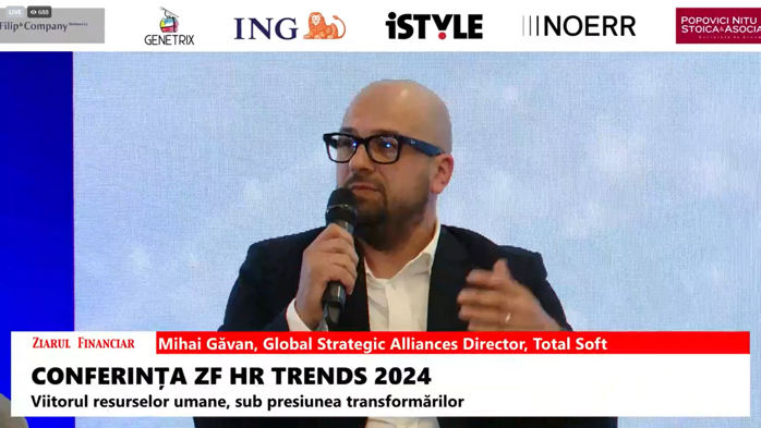 Mihai Găvan, Global Strategic Alliances Director în cadrul TotalSoft, unul dintre cei mai importanţi producători de software de pe piaţa locală, a vorbit în cadrul conferinţei ZF HR TRENDS 2024: Viitorul resurselor umane, sub presiunea transformărilor. despre cum inteligenţa artificială creşte productivitatea angajaţilor şi despre faptul că joburile oamenilor nu vor dispărea odată cu noile tehnologii.