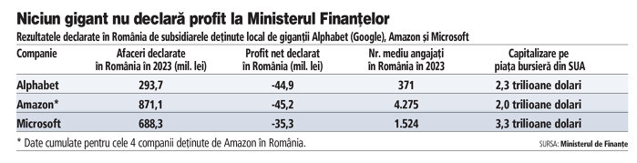 Niciun gigant american din domeniul tehnologiei care operează în România, Microsoft, Amazon şi Google, nu declară profit la Ministerul Finanţelor