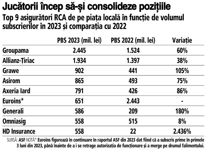 ♦ Omniasig este singurul asigurători RCA care a înregistrat o creştere relativ mică a subscrierilor pe piaţa RCA anul trecut, faţă de ritmurile consemnate de restul jucătorilor. ♦ Cel mai mare avans a fost al Hellas Direct Insurance, sucursală care acivează pe baza FoE (freedom of establishment), volumul subscrierilor fiind de peste 20 de ori mai mare în 2023, faţă de 2022 când abia îşi începuse activitatea pe piaţa locală.♦Prima medie anualizată RCA a crescut cu circa 7% în 2023, la nivelul pieţei, până la 1.219 lei.