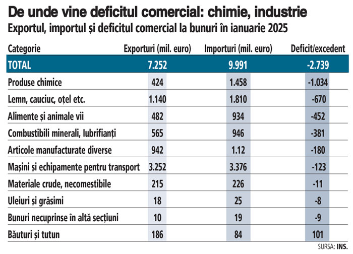 Primele date din 2025 despre comerţul internaţional al României: Veste proastă pentru economie: importurile au crescut cu 10% în ianuarie, iar exporturile doar cu 2%. Exporturile României au fost de 7,3 mld. euro în ianuarie 2025, o creştere de puţin peste 2%. În aceeaşi vreme, însă, importurile au crescut cu 10% şi au fost de aproape 10 mld. euro