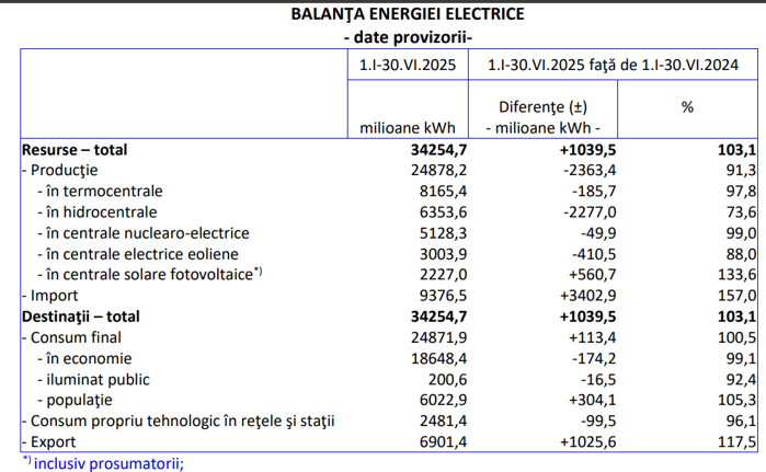 Producţia de energie electrică a scăzut în primele şase luni ale anului cu aproape 9%, în timp ce importurile au crescut cu 57%, iar exporturile de energie cu 17%, arată datele publicate marţi de INS.