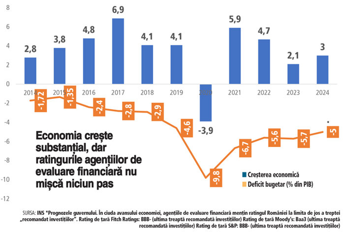 Ratingul suveran al României este pe ultima treaptă recomandată investiţiilor, de 15 ani. De ce, de vreme ce economia a crescut puternic în aceşti ani, România se pregăteşte pentru OCDE şi datoria publică e sub control? România a plătit anul trecut dobânzi la creditele publice de 31 de miliarde de lei, adică 2% din PIB sau 5% din bugetul consolidat