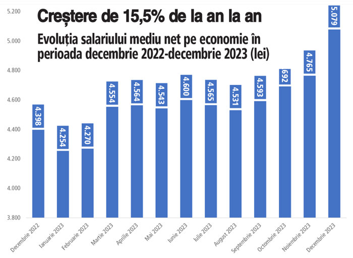 Salariul mediu net pe economie a spart borna de 1.000 de euro. Dublarea salariilor câştigate de români a avut loc în opt ani. În decembrie 2023, salariul mediu net a fost de aproape 5.100 de lei, iar în decembrie 2016 era de circa 2.354 de lei, echivalentul a puţin peste 500 de euro la cursul de la acea vreme
