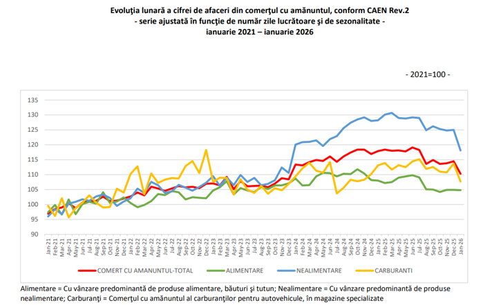 Afacerile din comerţ s-au redus drastic în luna ianuarie 2026, în scădere cu 25% faţă de decembrie 2025 şi cu 9,1% faţă de ianuarie 2025, pe măsură ce consumatorii şi-au diminuat cheltuielile de consum.