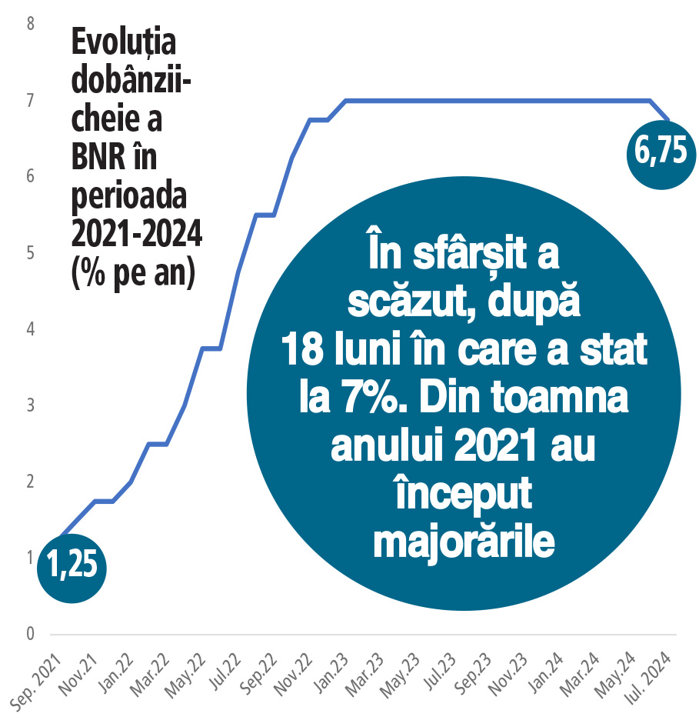 Scăderea accelerată a inflaţiei convinge BNR să dea startul relaxării monetare în iulie. BNR a tăiat dobânda-cheie la 6,75%, de la 7% unde staţiona de un an şi jumătate