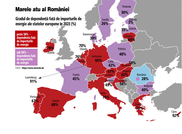 Singura ancoră în plină furtună globală rămân resursele: România are una dintre cele mai mici dependenţe de importuri energetice din UE. Anul trecut, gazul intern şi depozitele au acoperit cererea. Creşterea producţiei de energie şi gaze devine obligatorie