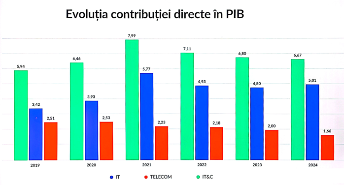 Contribuţia directă a industriei IT&C la formarea PIB a fost de 6,67% în 2024, în scădere faţă de 6,8% în 2023 şi 7,11% în 2022, pe fondul scăderii industriei de comunicaţii, conform unui studiu prezentat de Asociaţia Patronală a Industriei de Software şi Servicii (ANIS).