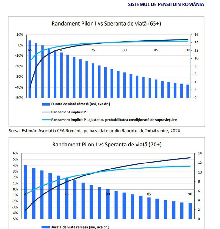 Randamentul Pilonului I (calculat ca IRR – Internal Rate Of Return) este negativ până la vârsta de 74 de ani, se arată într-un studiu al prestigioasei asociaţii CFA România. “Cu alte cuvinte, pensia de Pilon I presupune că beneficiile primite până la 74 de ani vor fi mai mici decât contribuţiile de-a lungul carierei, ambele ajustate conform presupunerilor de mai sus. Cu toate acestea, randamentul implicit al Pilonului I creşte odată cu vârstei până la care se primeşte pensia de stat, ajungând la puţin peste 5% în cazul unui participant care ajunge la vârsta de 90 de ani”.
