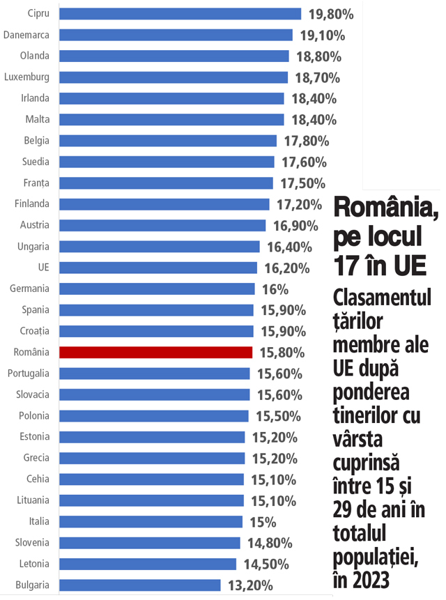 ♦ Media Uniunii Europene este de 16,2% ♦ Cea mai mare pondere a tinerilor în rândul populaţiei totale a fost în Cipru, de 19,8% ♦ Cea mai mică valoare a acestui indicator a fost înregistrată în Bulgaria, de puţin peste 13%.