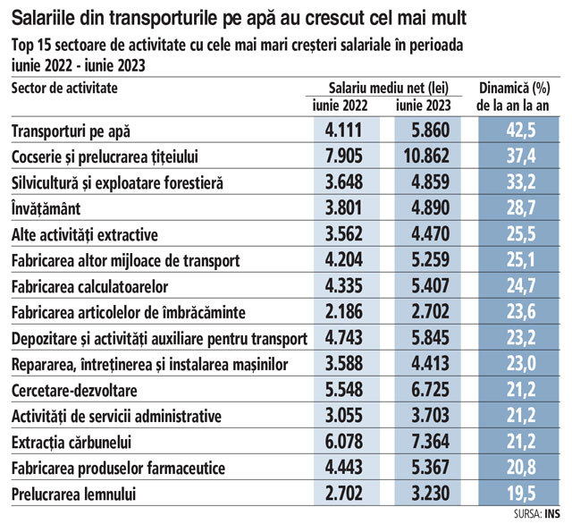 Top 15 sectoare cu cele mai mari creşteri salariale: Salariile angajaţilor din silvicultură, transporturile pe apă şi din prelucrarea ţiţeiului au crescut cel mai mult în ultimul an. În transporturile pe apă, salariile au crescut cu 42,5% în iunie 2023 faţă de aceeaşi lună din anul trecut, până la aproape 5.900 de lei net