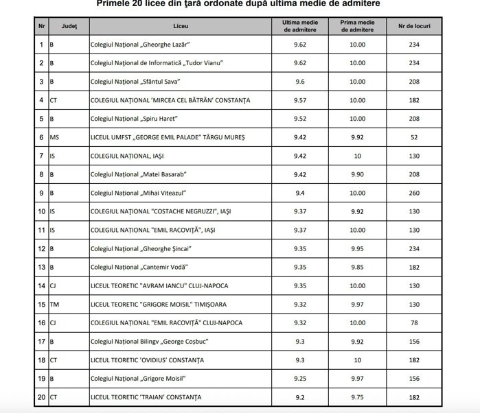 Colegiul Naţional „Gheorghe Lazăr”, Colegiul Naţional de Informatică „Tudor Vianu” şi Colegiul Naţional „Sfântul Sava” din Bucureşti sunt pe primele trei poziţii în top 20 licee din ţară după ultima medie de admitere de anul acesta, arată datele transmise de Ministerul Educaţiei.