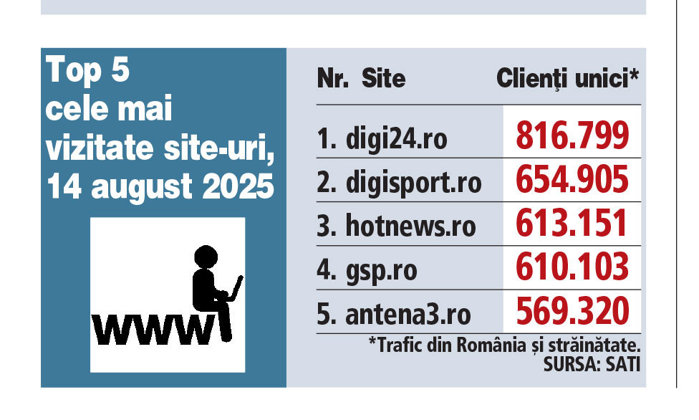Top 5 cele mai vizitate site-uri, 14 august 2025