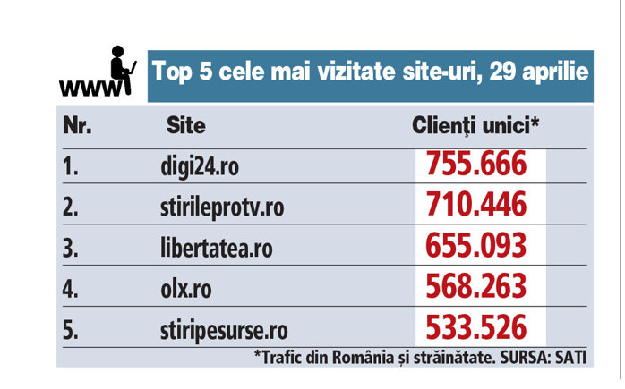 Top 5 cele mai vizitate site-uri, 29 aprilie 2024