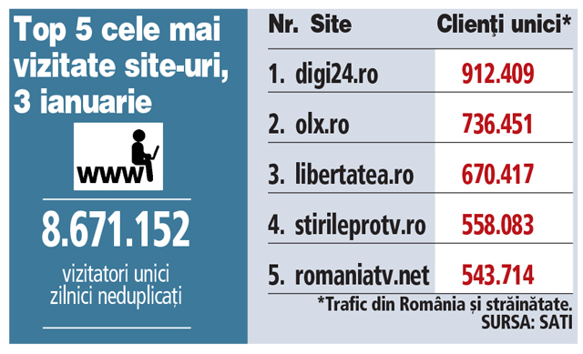 Top 5 cele mai vizitate site-uri, 3 ianuarie 2024