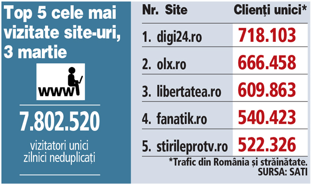 Top 5 cele mai vizitate site-uri, 3 martie 2024