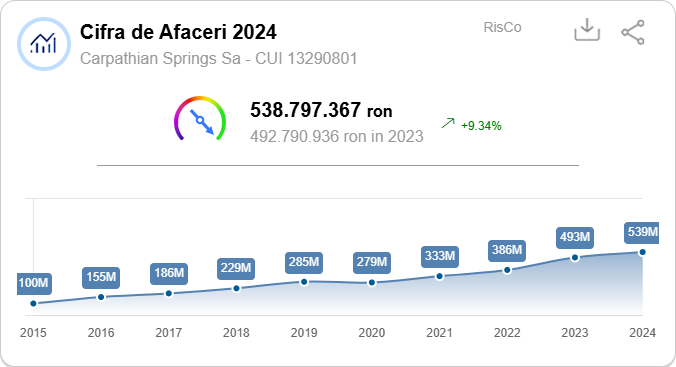 2. CARPATHIAN SPRINGS SA, Aqua Carpatica, a raportat o cifră de afaceri de 539 milioane lei, în creștere cu 9% față de raportarea anterioară, și un profit net de 102 milioane lei, de la un profit de 79 milioane lei înregistrat anterior. Compania a raportat 356 de angajați, cu vânzări per angajat de 1,5 milioane lei și un profit per angajat de 287.000 lei.