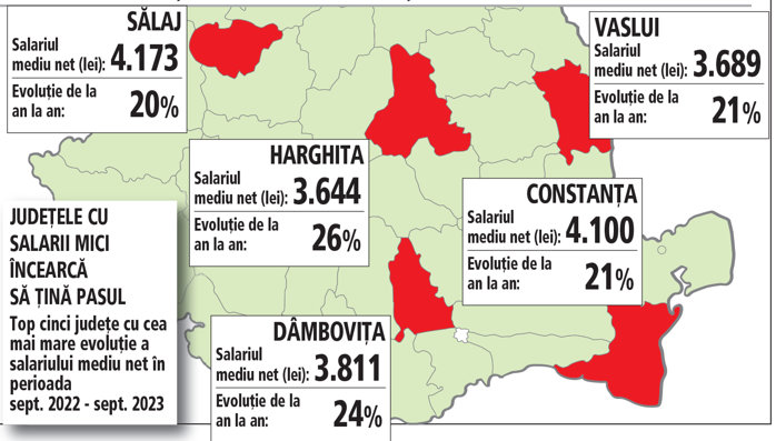 Top judeţe după creşterile salariale: judeţele cu salarii mici încearcă să ţină pasul cu salariul mediu pe economie şi au ajuns la creşteri de peste 20%
