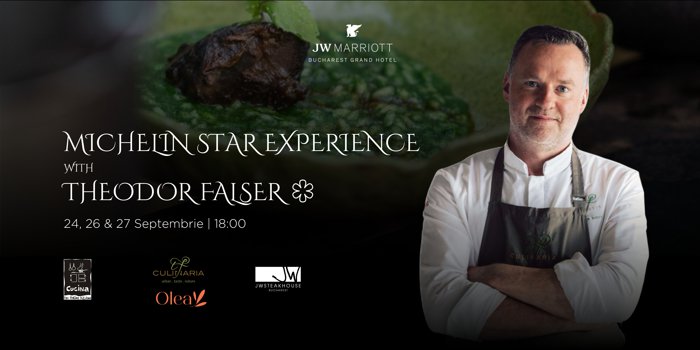 Cu o experienţă de peste 30 de ani în hoteluri de cinci stele din întreaga lume, Chef Theodor Falser s-a făcut remarcat prin conceptul „Taste Nature” la Johannestube (Alto Adige, Tirolul de Sud), unde fiecare ingredient provine exclusiv din regiunea locală.Pionier al gastronomiei sustenabile în Europa, Chef Falser colaborează îndeaproape cu fermieri, pescari şi producători locali, pentru a crea preparate ce reflectă sezonalitatea, autenticitatea şi respectul pentru natură. Pe lângă recunoaşterea cu o stea Michelin, dedicaţia sa a fost recompensată cu 17 puncte Gault & Millau şi includerea în prestigiosul clasament La Liste – Top 1000 Restaurante din lume.Mai mult decât un chef, Theodor Falser este un povestitor care reinterpretează tradiţia, transpunând frumuseţea naturii într-o artă culinară desăvârşită.3 experienţe atent pregătiteFiecare seară este gândită ca o călătorie culinară, unde tradiţia se întâlneşte cu inovaţia, iar ingredientele simple devin poveşti memorabile. Este o ocazie rară de a descoperi arta unui chef distins cu stea Michelin, într-un cadru intim şi rafinat.24 septembrie 2025 18:00 – 20:00 JW SteakhouseDescoperiţi o seară de neuitat alături de Chef Theodor Falser, distins cu stea Michelin, la JW Steakhouse — un masterclass şi o cină cu 3 preparate ce celebrează gastronomia inspirată din natură.Selecţii din meniu: „spaghetti” din ton crud, vrăbioară de vită Wagyu, smochine coapte.Preţ: 1200 lei/de persoană26 septembrie 2025 18:00 OleaTrăiţi experienţa unei cine Michelin cu 5 preparate cu specific Middle’terranean, semnată de Chef Theodor Falser la Olea, unde aromele îndrăzneţe şi rafinamentul se îmbină într-o călătorie culinară exclusivistă.Selecţii din meniu: Pâine cu maia & Muhammara dip, Scoici Saint Jacques cu crustă dukkha, Crevete uriaş crocant, Risotto Carnaroli Acquerello, Viţel marinat cu Ras el Hanout, Tiramisu oriental.Preţ: 1200 lei/de persoană27 septembrie 2025 18:00 Cucina - The Italian KitchenSavuraţi o cină Michelin cu 5 preparate cu specific italian, creată de Chef Theodor Falser la Cucina, unde aromele atemporale şi eleganţa modernă se unesc într-o experienţă culinară rafinată.Selecţii din meniu: Ciabatta cu gremolata, Salată de homar, Ravioli Plin de casă, Risotto Carnaroli cu fructe de mare, Muşchi de vită Black Angus „alla Rossini”, Panna cotta cu ciocolată şi mascarpone.Preţ: 1200 lei/de persoanăRezervă-ţi experienţa culinară acumLocurile pentru aceste seri exclusive sunt limitate. Vă invităm să descoperiţi arta culinară a lui Chef Theodor Falser la JW Marriott Bucharest Grand Hotel şi să vă asiguraţi participarea din timp.Pentru rezervări şi informaţii suplimentare, vă rugăm să ne contactaţi la 0724 000 786, sau vizitând următorul link: Official Gift Vouchers for JW Marriott Bucharest Grand Hotel , Bucharest.