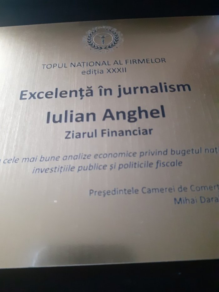 Jurnalistul Iulian Anghel, editor al Ziarului Financiar, a primit din partea Camerei de Comerţ şi Industrie a României “Premiul de excelenţă în jurnalism” pentru “cele mai bune analize economice privind bugetul naţional, investiţiile publice şi politicile fiscale”.