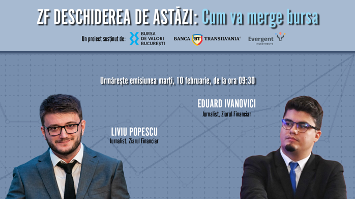 Urmăriţi ZF Deschiderea de Astăzi, 10 februarie, cu Liviu Popescu şi Eduard Ivanovici, jurnalişti ZF. Care sunt direcţiile pieţei de capital şi ce semnale transmit investitorii la început de februarie?