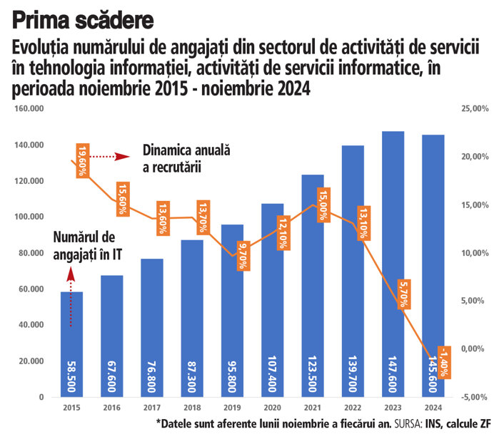 Urmează conferinţa ZF HR Trends. „2025, un an decisiv pentru HR: la răscrucea între inovaţie şi rezilienţă”. Echilibru între cererea şi oferta de forţă de muncă în IT. Ce aduce anul 2025 pentru acest sector? După un deceniu de creştere accelerată, numărul de angajaţi din IT a scăzut în 2024